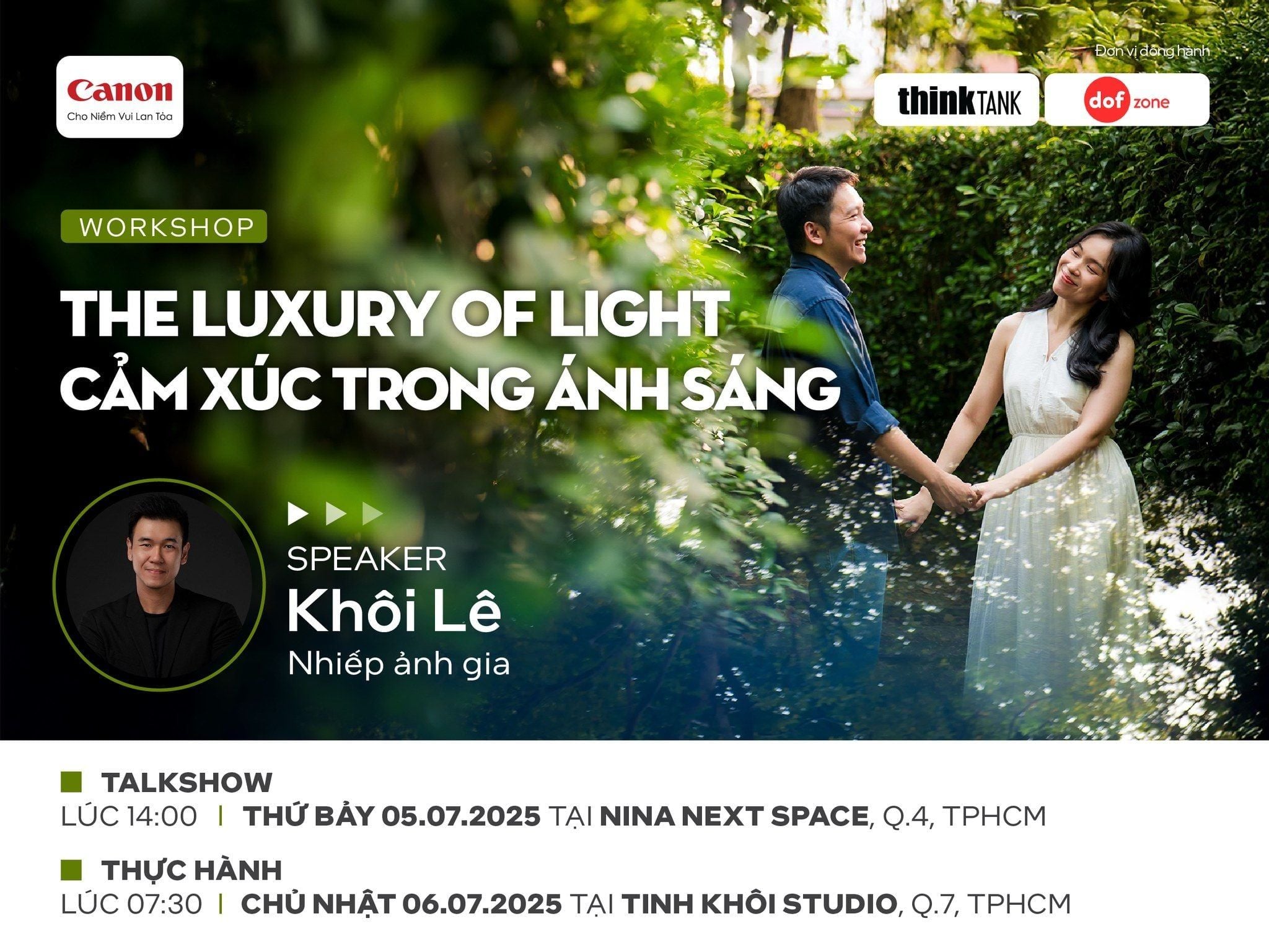 - Địa điểm: Nina Next Space, Quận 4, TP.HCM (Talkshow: 14:00, Thứ Bảy 05/07/2025) và Tinh Khôi Studio, Quận 7, TP.HCM (Thực hành: 07:30, Chủ Nhật 06/07/2025)