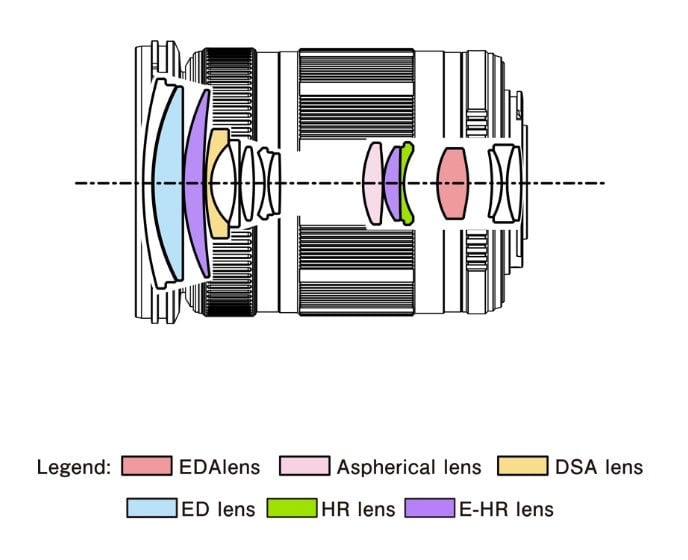 Ống kính sở hữu 15 thấu kính trong 11 nhóm, bao gồm thấu kính Dual Super Aspherical (DSA), ED (Extra-low Dispersion) và 3 thấu kính HR (High Refractive), đảm bảo chất lượng hình ảnh sắc nét, kiểm soát quang sai tốt và độ tương phản cao trên toàn dải tiêu cự.