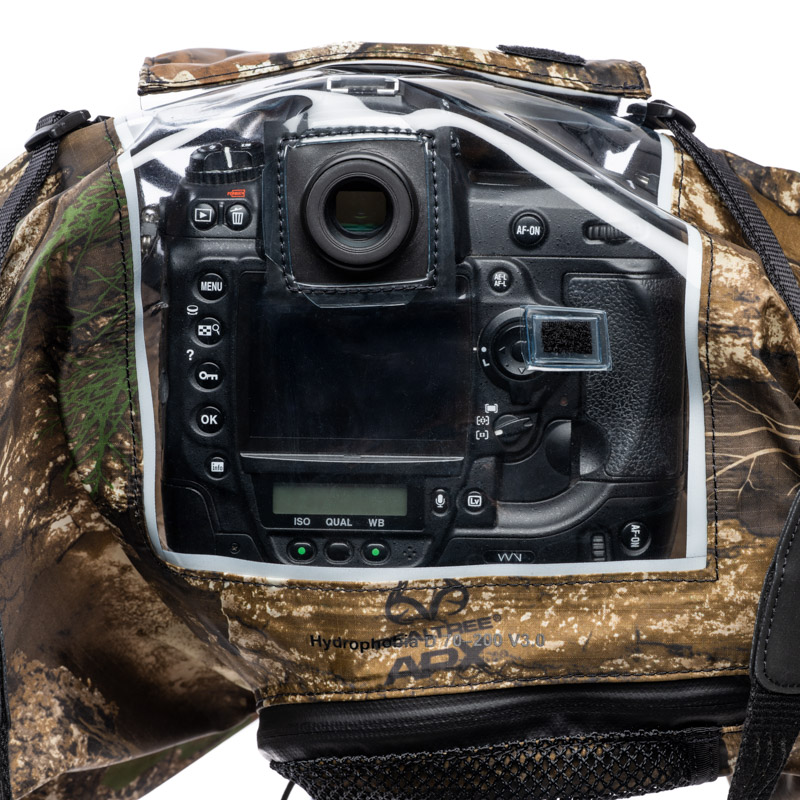Ngoài ra, hai tay áo có thể cinchable giúp dễ dàng truy cập vào các chức năng máy ảnh của bạn. Một nắp thị kính gấp lại thành tấm che hoặc che kính ngắm khỏi mưa hoặc bụi khi không sử dụng. Một túi đựng thị kính được tích hợp ở dưới cùng của nắp và thị kính có sẵn riêng biệt cho phép truy cập đầy đủ vào kính ngắm của bạn đồng thời bảo vệ máy ảnh của bạn.