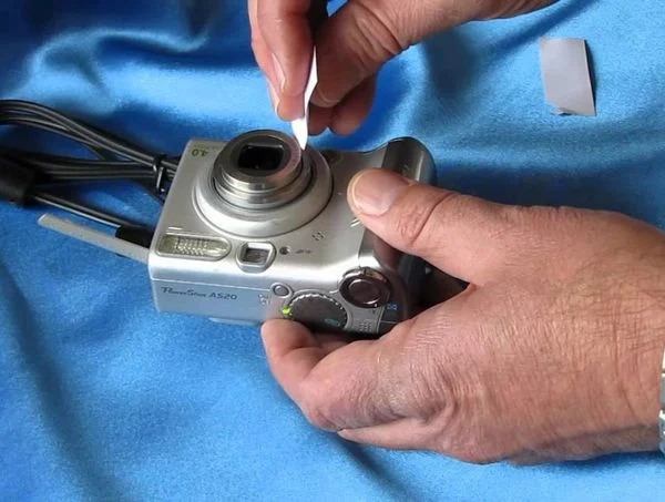 Sử dụng máy làm sạch hoặc dụng cụ thổi hơi nhẹ nhàng vào nắp ống kính khi ống kính đang bị kẹt do cát bám. Tuyệt đối không thổi cát vào những cơ cấu khác của máy ảnh. Lưu ý rằng khi thực hiện thao tác thổi, bạn nên sử dụng các công cụ làm sạch máy ảnh để đảm bảo sự sạch sẽ và tránh làm hỏng máy ảnh.