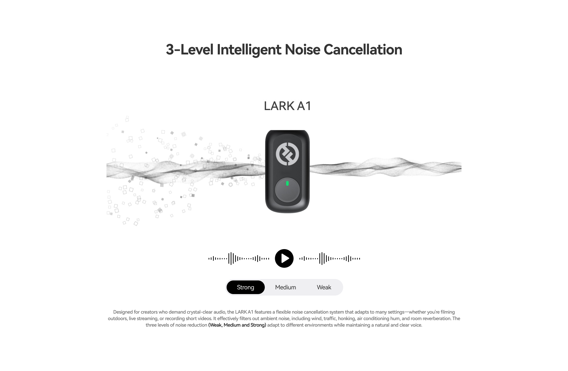 LARK A1 là giải pháp micro không dây chuyên dụng dành cho smartphone, mang lại khả năng ghi âm chất lượng cao 48kHz/24-bit với thao tác cắm-và-dùng đơn giản. Âm thanh trong trẻo, sắc nét từng chi tiết, kết hợp công nghệ khử nhiễu thông minh 3 cấp độ giúp loại bỏ tiếng ồn môi trường như gió, xe cộ, hay tiếng điều hòa.