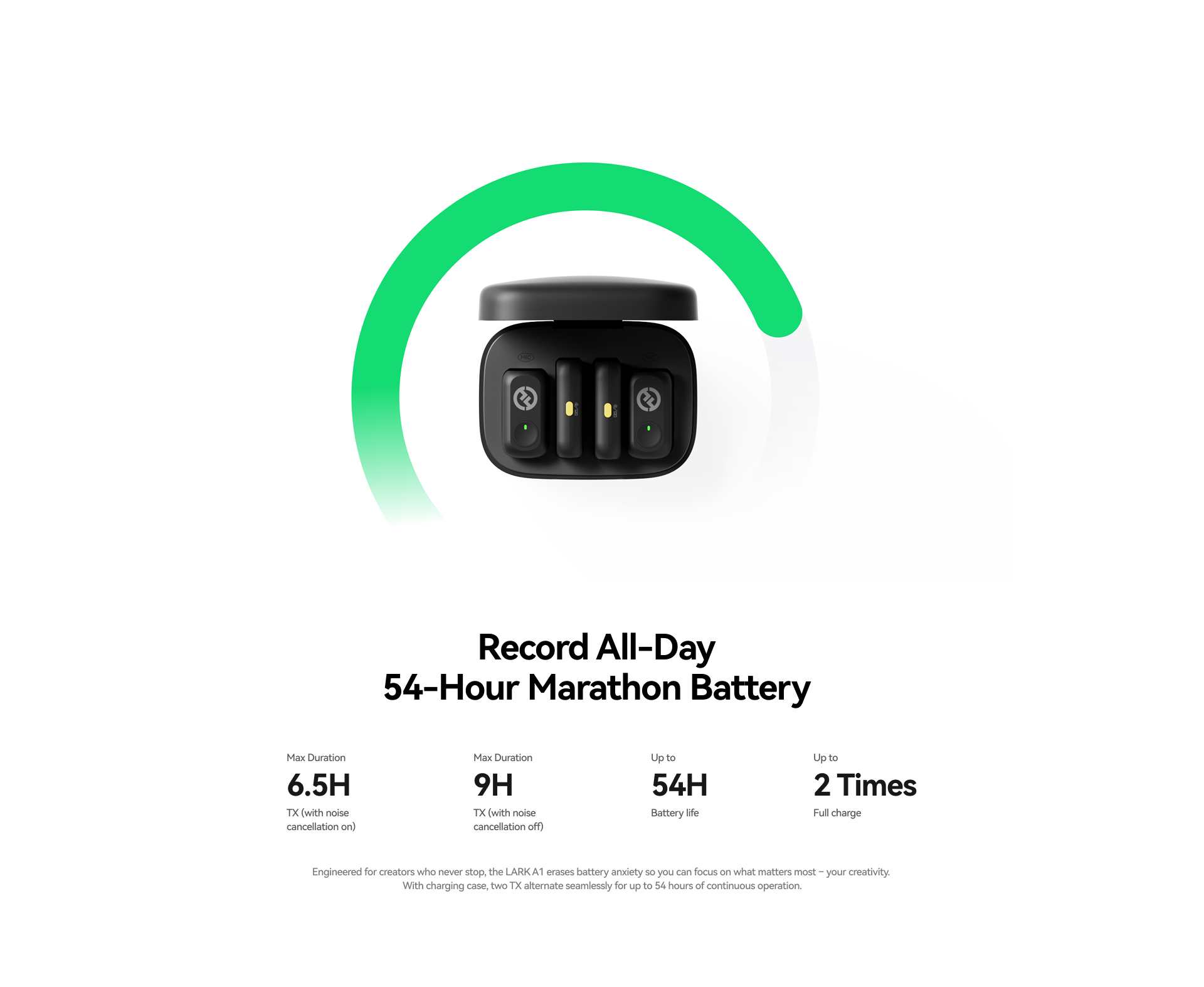 Dành cho những ngày quay dài liên tục: hộp sạc cung cấp tới 54 giờ sử dụng (TX đơn lẻ). TX: 6.5h khi bật khử nhiễu, 9h khi tắt. Sạc đầy 2 lần cho 2 TX thông qua hộp.