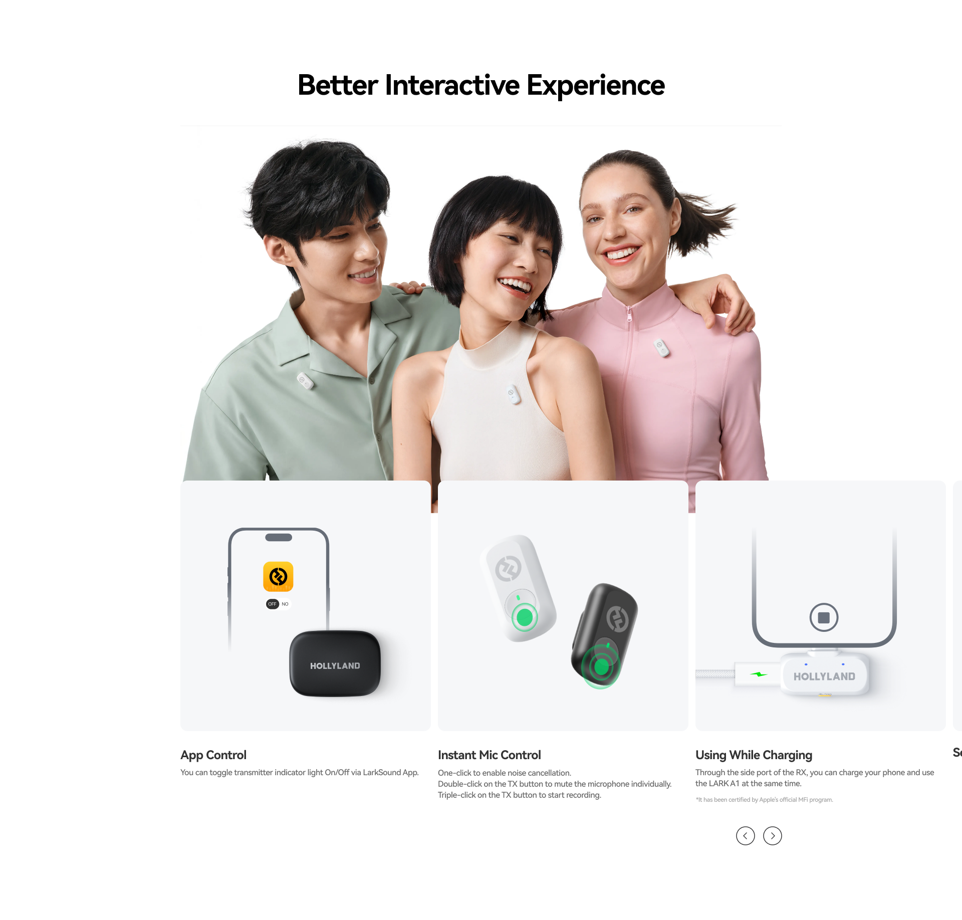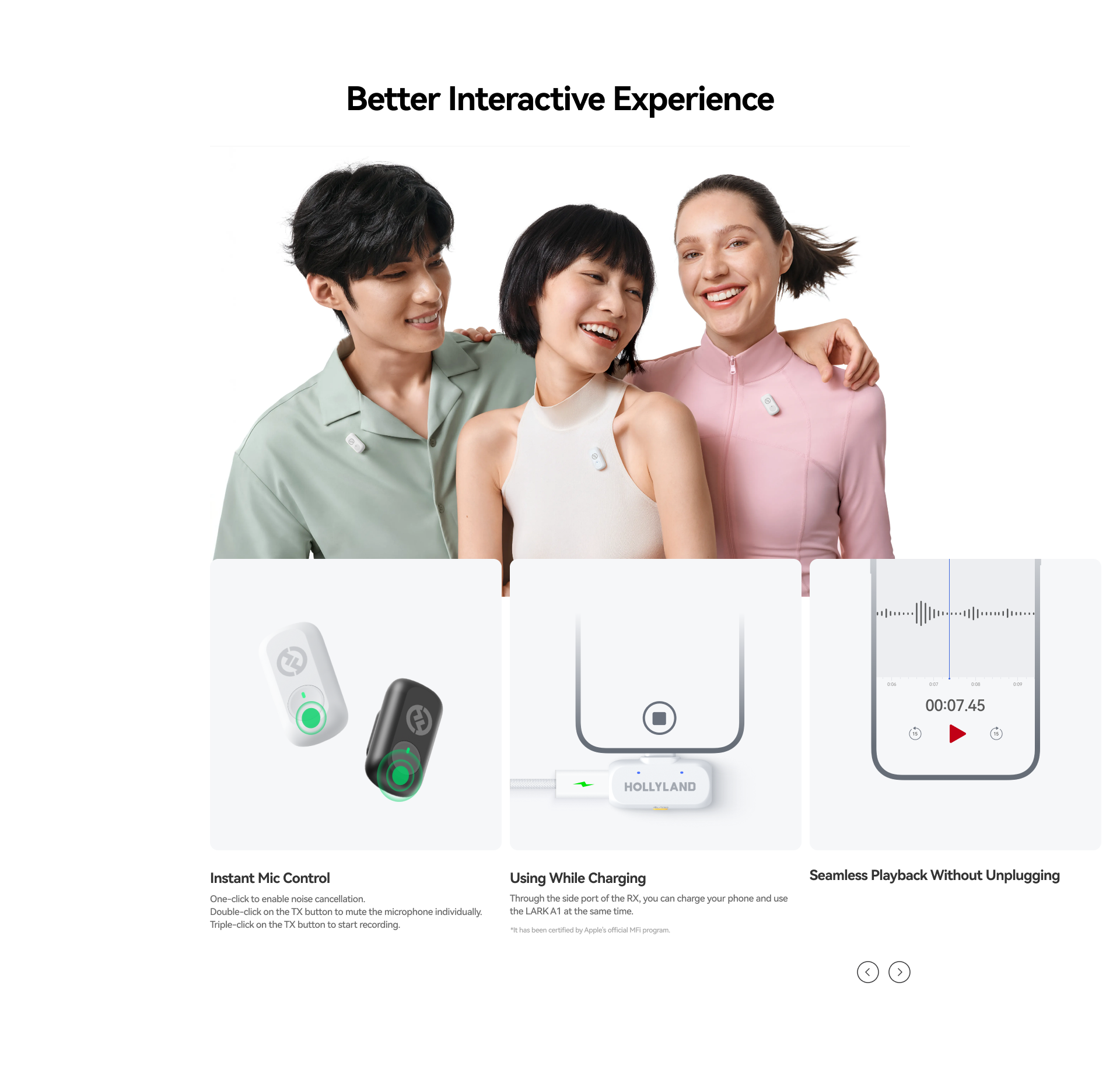 Qua cổng sạc bên hông RX, bạn có thể vừa sử dụng LARK A1 vừa sạc điện thoại. Tương thích hoàn toàn với thiết bị Apple – đạt chuẩn MFi được Apple chứng nhận.