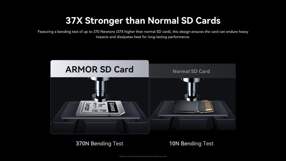 Lexar ARMOR SILVER PRO là thẻ nhớ đầu tiên trên thế giới sử dụng thép không gỉ trong thiết kế vỏ ngoài, cho khả năng chịu lực lên đến 370N, gấp 37 lần so với thẻ SD thông thường. Không chỉ bền, vật liệu thép còn giúp tản nhiệt hiệu quả, đảm bảo hiệu suất ổn định ngay cả khi làm việc kéo dài.
