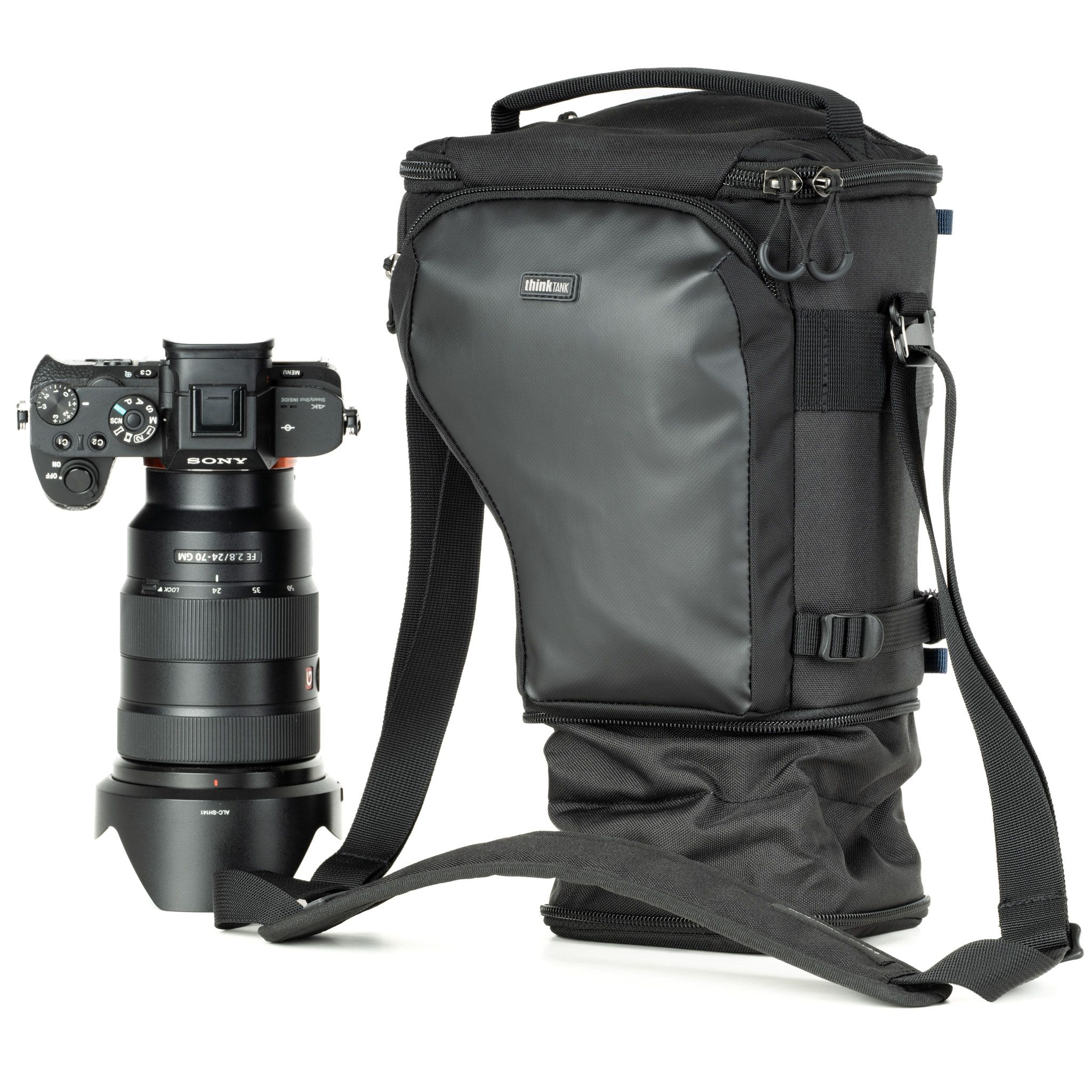Phù hợp với thân máy tiêu chuẩn với ống kính 24-70mm f2.8 gắn kèm với loa che nắng đảo ngược. Khi mở rộng ra, túi máy ảnh phù hợp với ống kính 70-200mm f2.8 với loa che nắng đảo ngược.