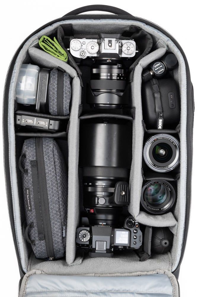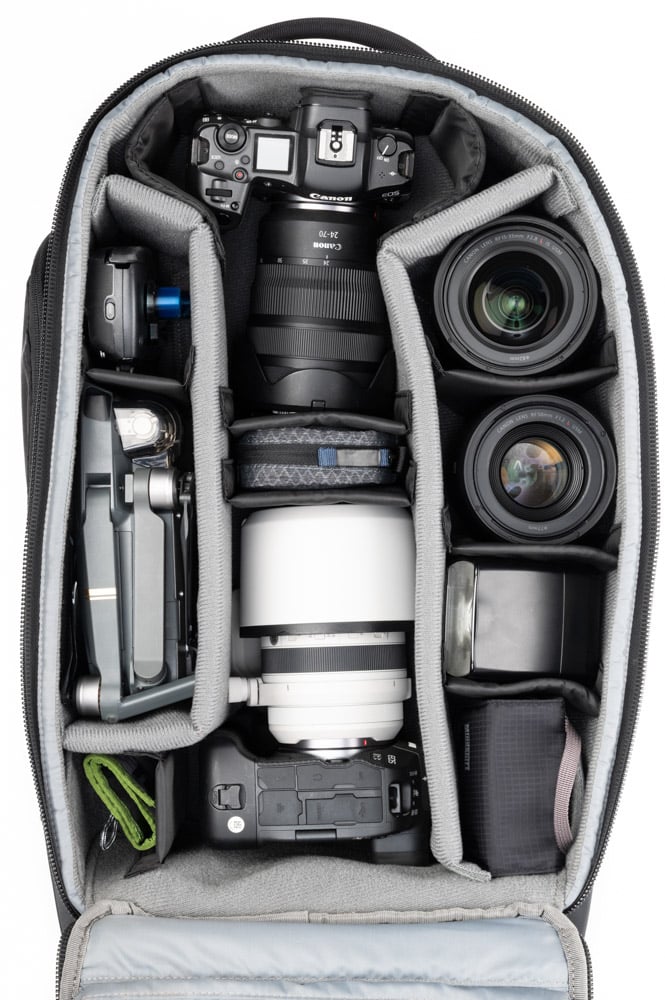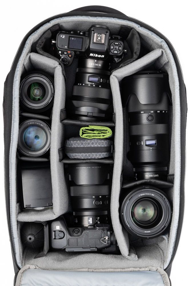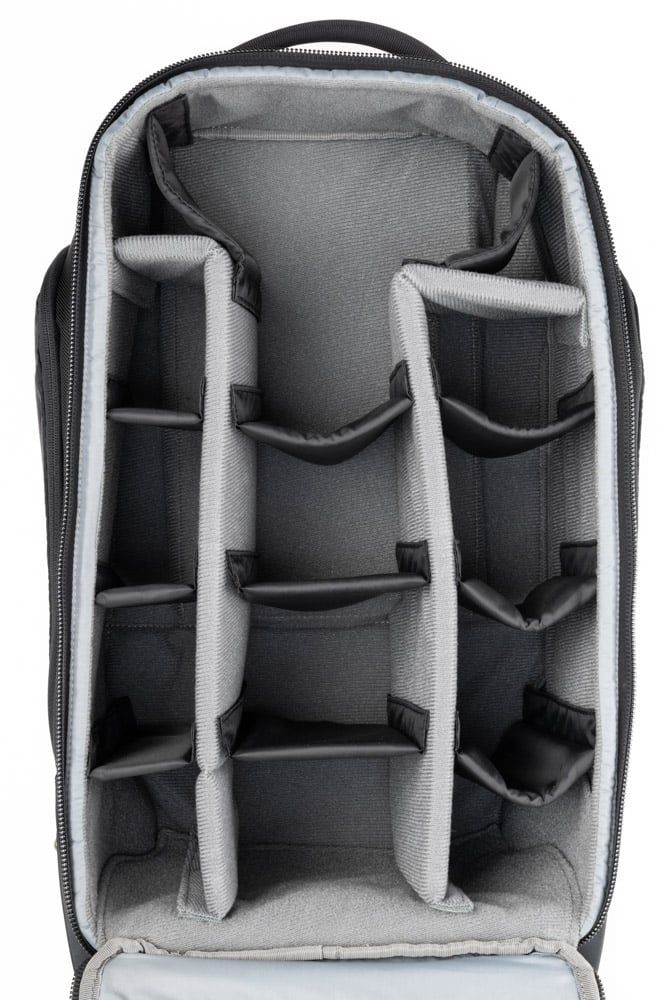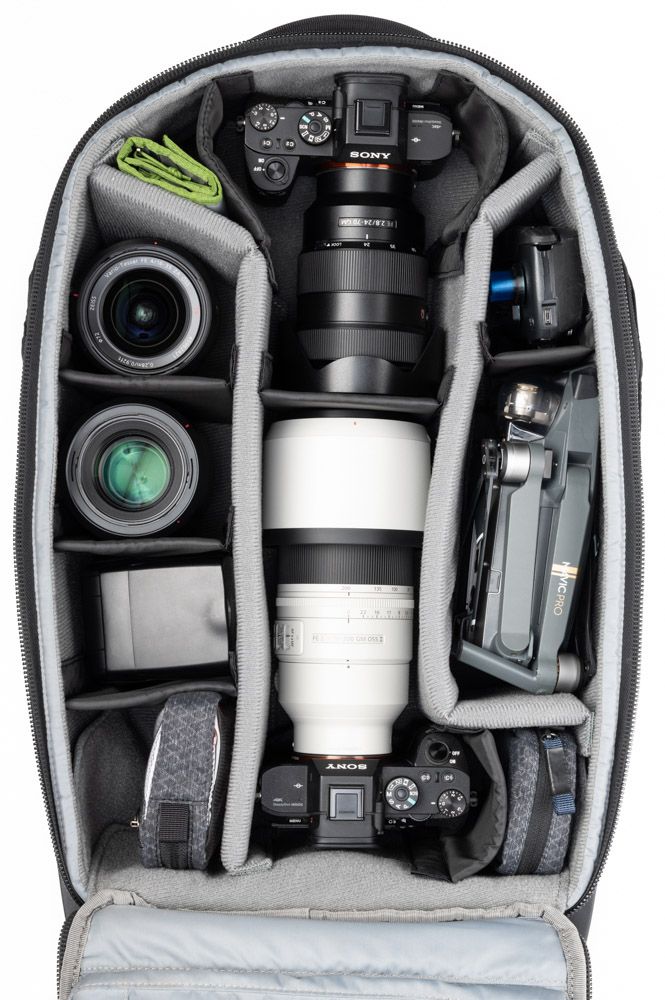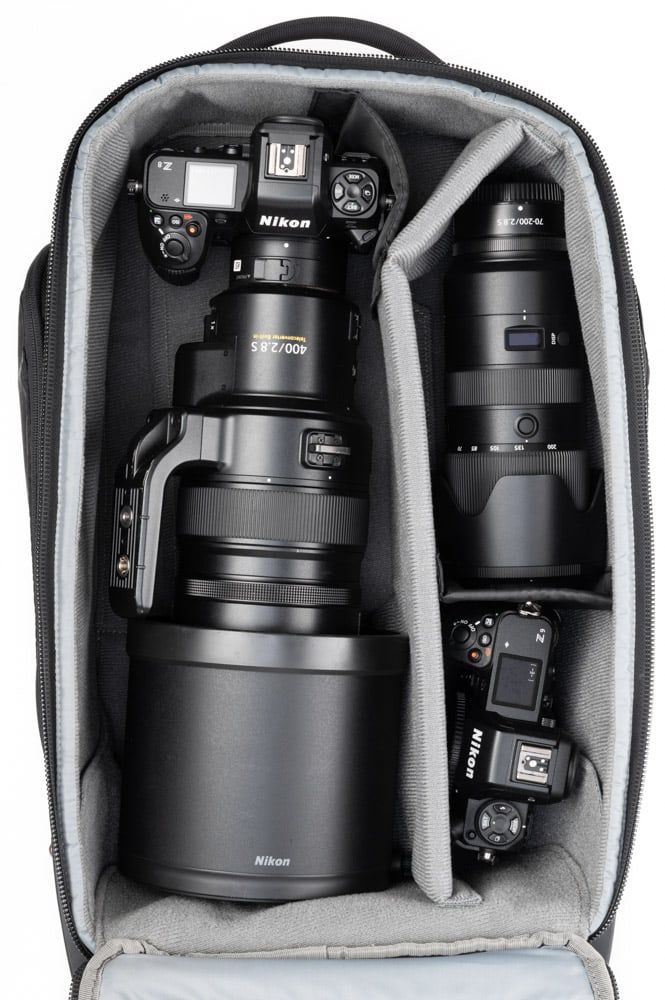 - Ngăn chứa máy ảnh sâu, phù hợp chứa đồng thời 2 thân máy (1 có grip, 1 tiêu chuẩn), ống kính dài xếp dọc và ống kính ngắn xếp chồng